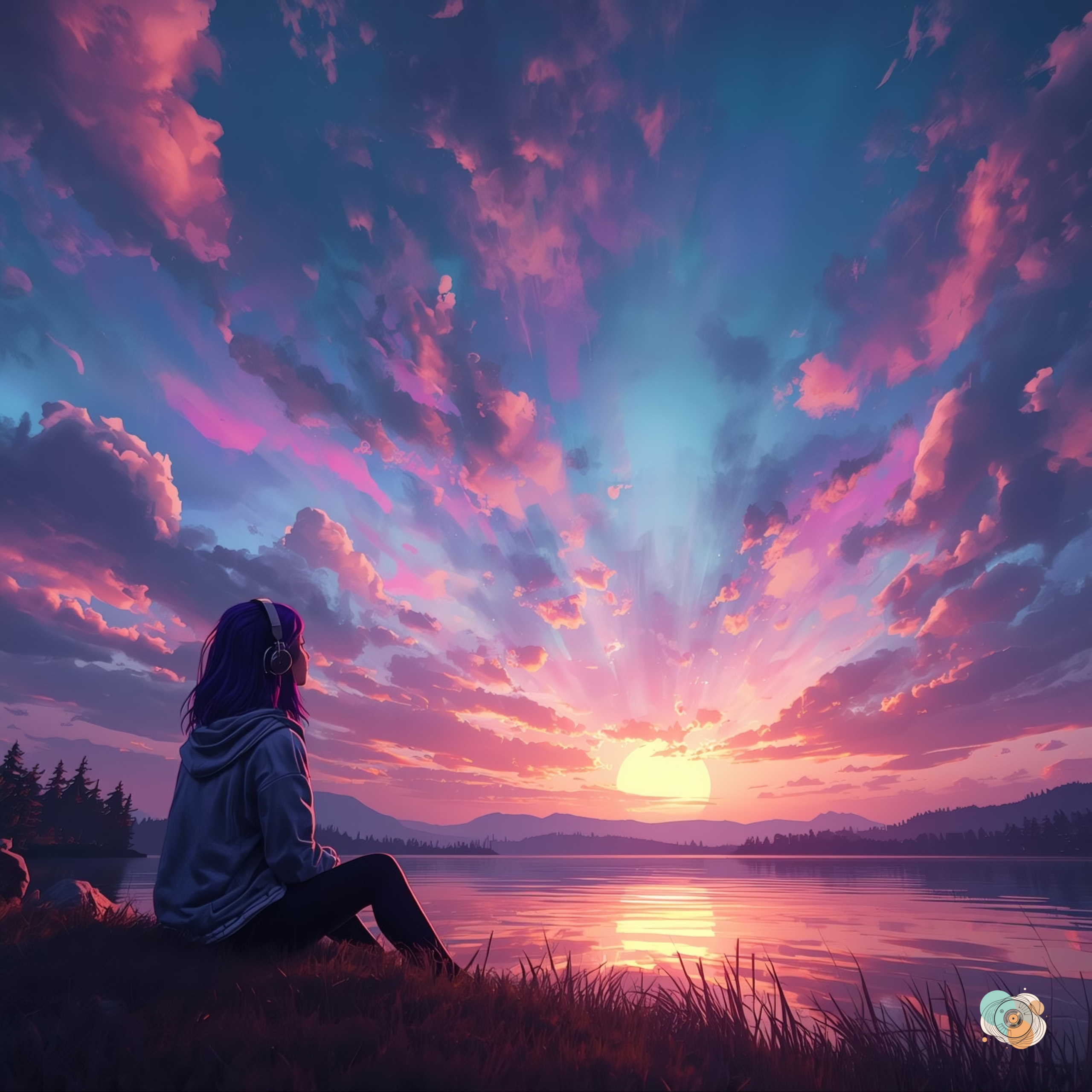 Dusk Harmony sways with its relaxed swung groove, echo guitars drifting like twilight haze, and soft piano textures adding warmth. It evokes a girl wearing headphones, lost in music while gazing at the evening sunset, colours bleeding into night.